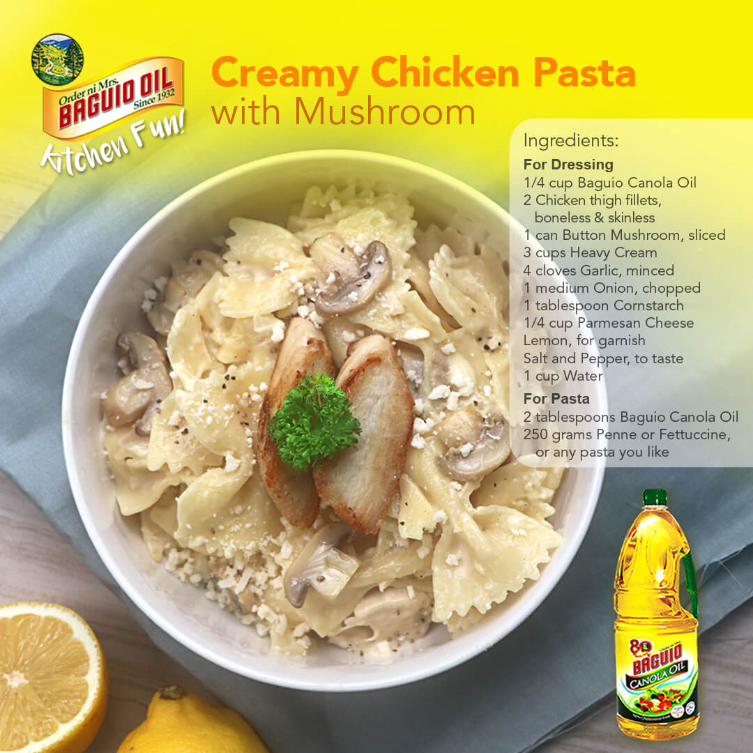 1. Cook the pasta in a large pot of boiling salted water with 2 tablespoons Baguio Canola Oil until al dente. Drain. Set aside.