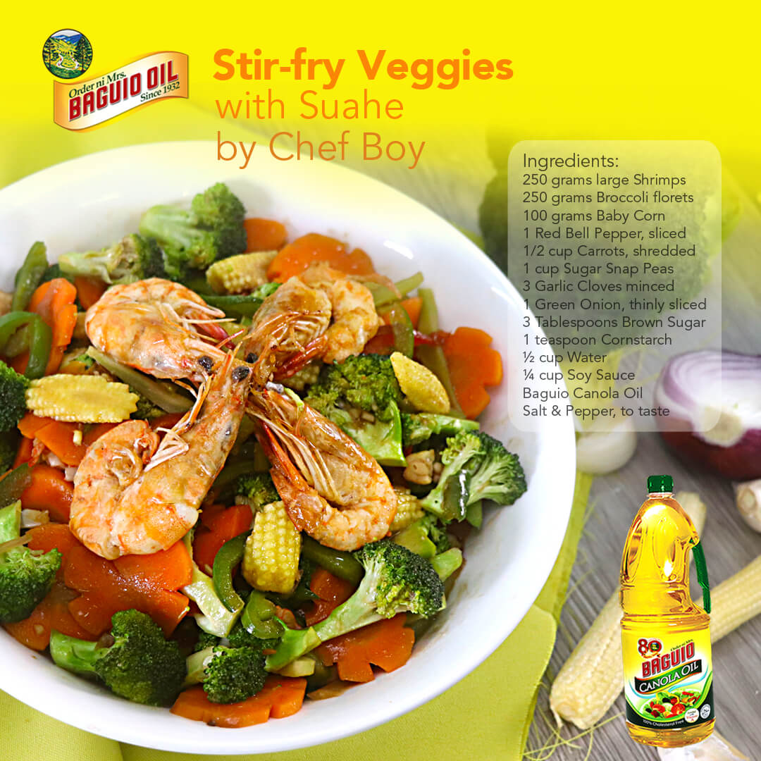 Heat Baguio Canola Oil in a frying pan. Add the shrimp and carrots. Season with salt and pepper. Cook for 3-5 minutes. Remove the shrimp from the pan and set aside.